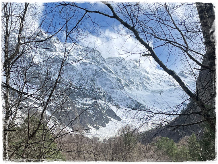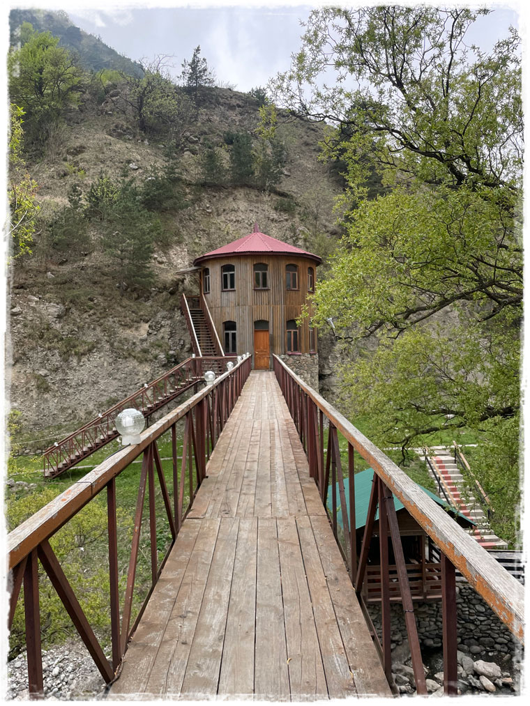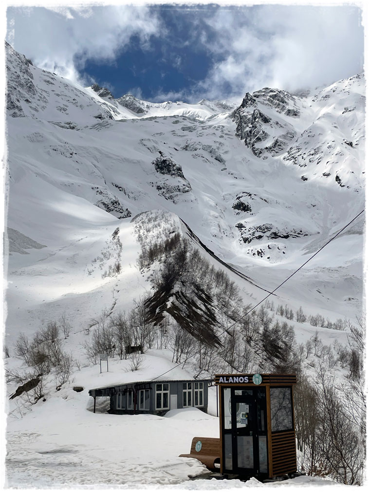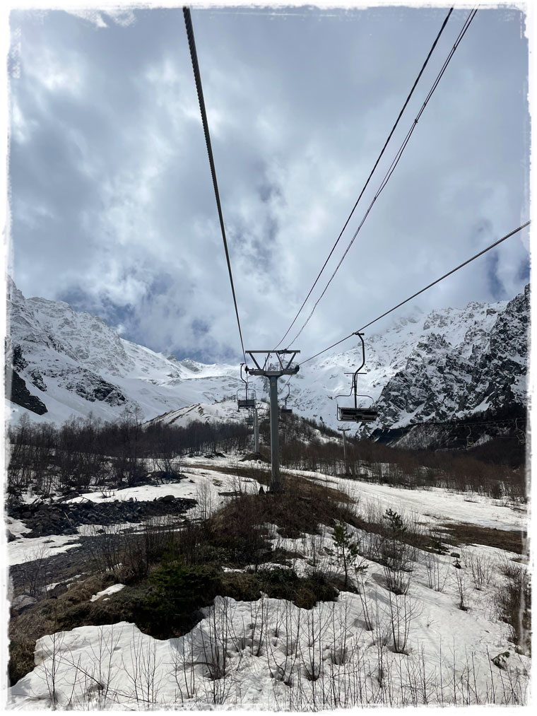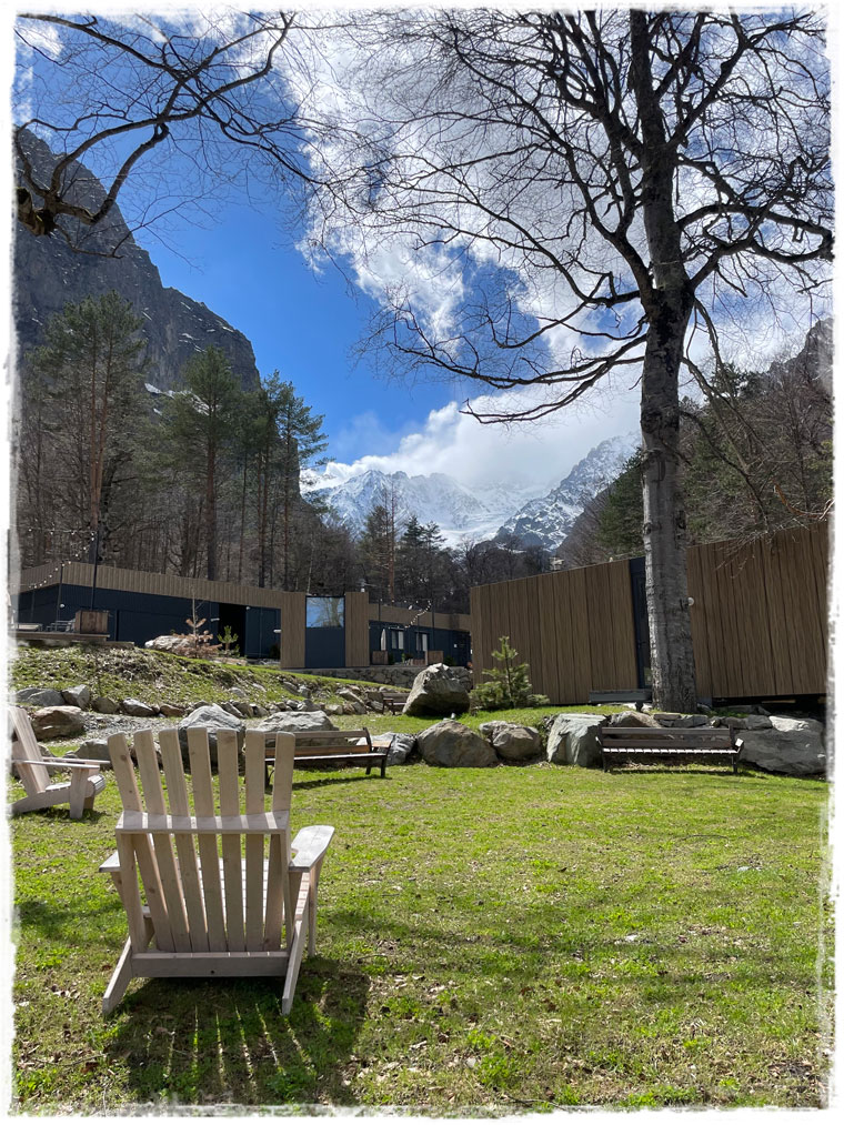 Второй причиной, почему я выбрала именно этот отель, стала его близость к канатной дороге, поднимающей к леднику. Ну сами посудите, быть в горах и к ним не подняться — несусветная глупость. Поэтому я решила не засиживаться и с самого утра направилась к станции подъемника. Поскольку большинство не живет в непосредственной близости от ледника, а приезжают из соседних сел, либо аж из самого Владикавказа, в это время на канатке еще никого из посетителей не было. Увидев меня, работники тут же засуетились и я стала первой, кто в этот день сел в кресло, кто поднялся на смотровую и кто ступил на подтаявший майский снег. Представляете, каково это — быть с горами абсолютно наедине?! Отвечаю — непередаваемо!!!Внизу меня сразу предупредили, чтобы с площадки никуда не уходила и даже не думала пытаться выше забраться. Горы и без того штука коварная, а в мае, когда на поверхности снег выглядит вполне надежно, но в мгновение ока может под ногами провалиться, лучше не экстремальничать и не рисковать. Я к рекомендациям местных без колебания прислушалась.Площадка наверху небольшая и когда туда постепенно начали подниматься другие путешественники, после полного единения с природой, даже от их присутствия и разговоров (читай криков: «Миш, сфоткай меня здесь! И здесь! Не так близко! Смотри, чтобы второй подбородок не видно было! И чтобы ноги длинные…») сразу захотелось сбежать. К счастью, к этому моменту я уже воздухом надышалась и красотой налюбовалась. И в обратном направлении снова на подъемнике была совсем одна. Итого времени на знакомство со Сказским ледником ушло примерно 1,5 часа (20 мин. подъём + 20 спуск + полчаса на созерцание красоты).Но нельзя же было весь оставшийся день просто на территории отеля (пусть и очень красивой территории) просидеть. Так что, немного отдохнув и просушив после снега обувь, отправилась я на лесную прогулку по расположенной недалеко экотропе. О существовании тропы мне охранник в отеле подсказал, в противном случае, просто так по чаще я бы, естественно, лазить не пошла.Как позже оказалось, место это для прогулки популярное и сюда даже специализированные группы из города привозят. Во как! Дело всё в том, что в гуще леса запрятано святилище Реком — сакральное для осетин место. При посещении обязательно обратите внимание, что святилище разделено на две части — женскую и мужскую и заходить на территорию священного места не своего пола запрещено. Многие этим пренебрегают, так же, как и соответствующим внешним видом (особенно в летнее время года). Уважайте чужие традиции! Я, например, пока через лес шла, несколько раз мужчин встречали, которые озвучивали, что дальше будет мужская святыня и мне туда нельзя. После заверения, что об ограничениях мне известно и нарушать их я не намерена, с пожеланием приятной прогулки мы расходились дальше по своим делам.