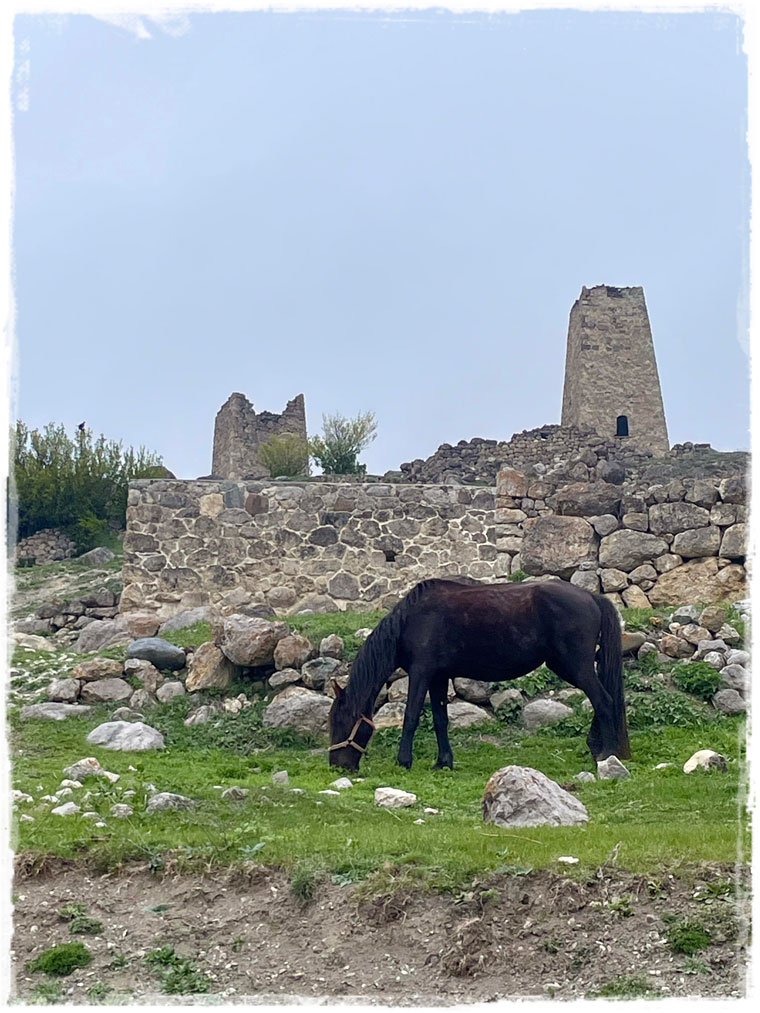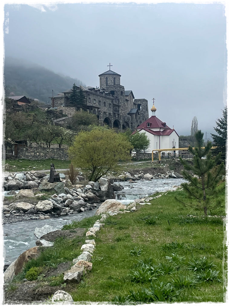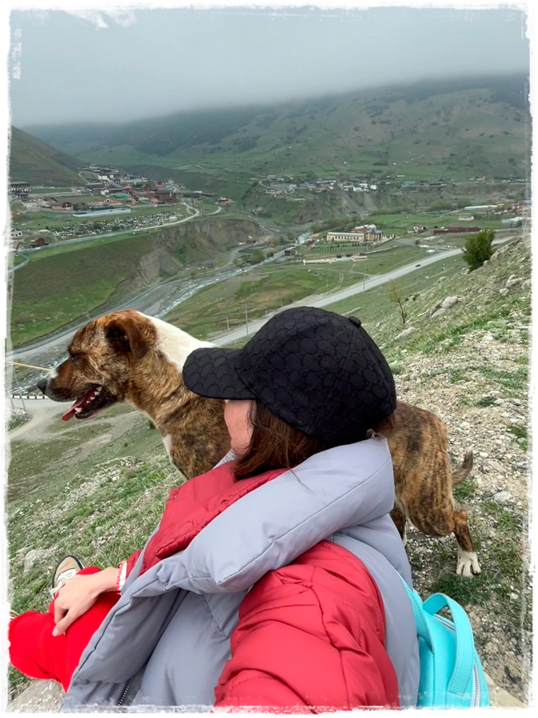По тому, как выглядела панорама долины в начале мая в не самую ясную погоду, могу себе представить, как она смотрится в полном летнем цветении и ярких солнечных лучах. Наверняка потрясающе. Но нам с лохматым гидом и этот вид доставил истинное удовольствие. Сама башня мне не понравилась. Стоящие совсем рядом частные дома впечатления подпортили. Зато обнаруженные случайно чуть дальше руины села Цмити, особенно с разгуливающими по ним благородными жеребцами, смотрелись невероятно эстетично и кинематографично.Дальше наш (а теперь это уже явно была наша общая прогулка с местным бравым парнем) маршрут лежал в сторону Аланского Свято-Успенского мужского монастыря. Скажу честно, заходить внутрь я не собиралась. Не было такого желания. Но так вышло, что мне и близко подойти не удалось — новый мохнатый парень запретил. Без шуток! Разъясняю: если идти к монастырю со стороны села Верхний Фиагдон, откуда я мы, собственно говоря, и направлялись, то сначала на пути попадается Церковь Жён Мироносиц. Церквушка небольшая, но прилегающая территория очень уютная, а еще здесь источник имеется, с водой, дарующей здоровье и долголетие. Внутрь мы не заходили, но по территории и я, и мой компаньон погуляли с огромным удовольствием. Но стоило мне двинуться в сторону монастыря, как проводник мой встал на месте, как вкопанный. Хвост поджал, глазами испуганными смотрел. Поначалу я пыталась его уговорить пойти со мной дальше, но он наотрез отказался. При этом, в обратную сторону не уходил, просто сидел на месте и ждал моего решения — пойду ли в монастырь или нет. Поскольку я к животным отношусь не только с огромной любовью, но и уважением, предпочитаю на подобные знаки внимание обращать и к их поведению прислушиваться. И что вы думаете? Только я кивнула головой, что, так и быть, в монастырь не пойду, и сделала шаг в обратную сторону, мохнатый мой дружочек радостно подпрыгнул, завилял хвостом и с языков на бок побежал по дороге (естественно, проверяя, следую ли я за ним). В общем, если хотите, можете считать меня чрезмерно суеверной или вообще какой-то странной, но, хотя о причинах поведения собакена мне неизвестно, в монастырь я решила всё-таки не ходить.По поводу того, что в монастырь не попала, я вообще не переживала, а вот о том, как буду прощаться со своим новым другом, волновалась. Не хотелось обижать лохматика, ведь ни с собой в отель, ни уж тем более в Москву, я его взять не могла. Но все мои муки совести были напрасны, поскольку, доведя меня до дверей отеля, как истинный джентльмен, кавалер лизнул на прощание руку, дал погладить себя по голове и резво отправился дальше по своим делам. Я специально потом проверила, меня он взглядом больше не искал и не оборачивался. Ну что за прелестное создание и самый лучший проводник.
