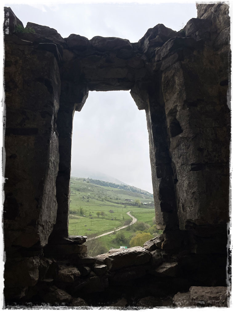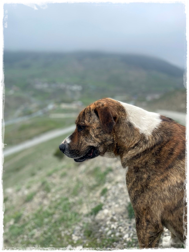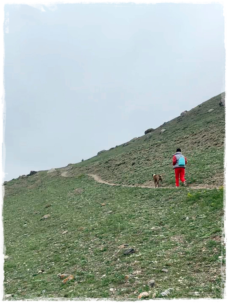 В обратную сторону весь путь целиком пешком я уже не одолела, устала, проголодалась. Поэтому вызвала такси и за 15 минут до отеля доехала (точка отправки на карте выше обозначена). Но и на этом приключения мои не закончились, поскольку лениться в такой красоте, которая прямо под боком, только руку протяни и ногу из отеля высуни, у меня совсем не получилось. И следующим пунктом на повестке дня стали Руины старинного села Цмити. Только о том, что там на холме какие-то руины существуют я уже после подъема узнала, а изначально просто увидела наверху очередную каменную башню и подумала: «А почем бы не забраться?!»Вот здесь не могу не поделиться интересной историей, которая произошла со мной во время последующей прогулки. Изначально я планировала, как обычно, бродить одна. Но у судьбы, судя по всему, на этот счет имелось свое мнение и она подкинула мне самого необычного из всех возможных сопровождающего. Выйдя из отеля и пройдя буквально пару метров, мне навстречу вышел местный пёс. Причём подошел так, как будто всю жизнь знакомы — без страха или стеснения. Подставил голову под руку для поглаживания и, получив необходимое внимание (а может и знак того, что против его компании я не буду), решил составить мне компанию для прогулки. Оговорюсь, что собак я обожаю и совсем не боюсь, поэтому даже грозный с виду и крупный уличный волкодав не вызывает во мне никаких чувств, кроме положительных эмоций и желания пообщаться. Так, в компании этого милого парня, я направилась вверх, к виднеющейся на фоне неба башне. Самое любопытное, что проводник мой оказался очень ответственным (не все гиды себя так ведут, хочу заметить) и стоило мне притормозить, чтобы фото сделать или шнурок завязать, он меня обязательно ждал. А если сильно отставала — оглядывался, проверяя, иду ли я за ним след в след.
