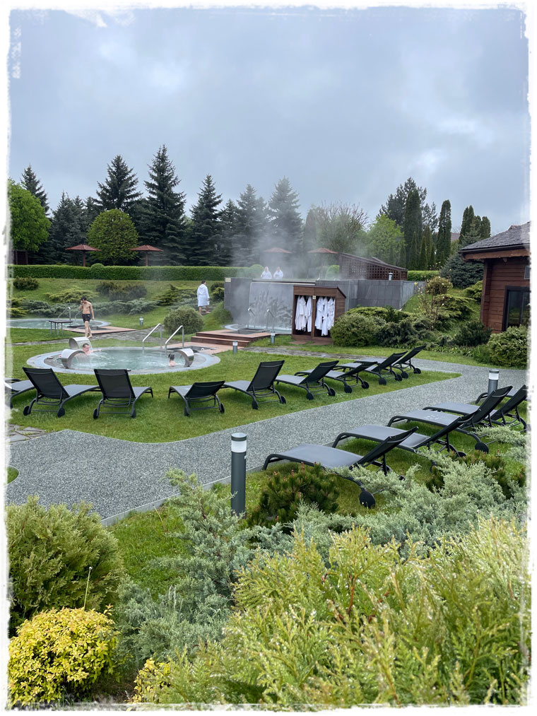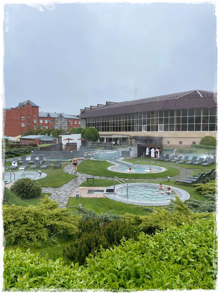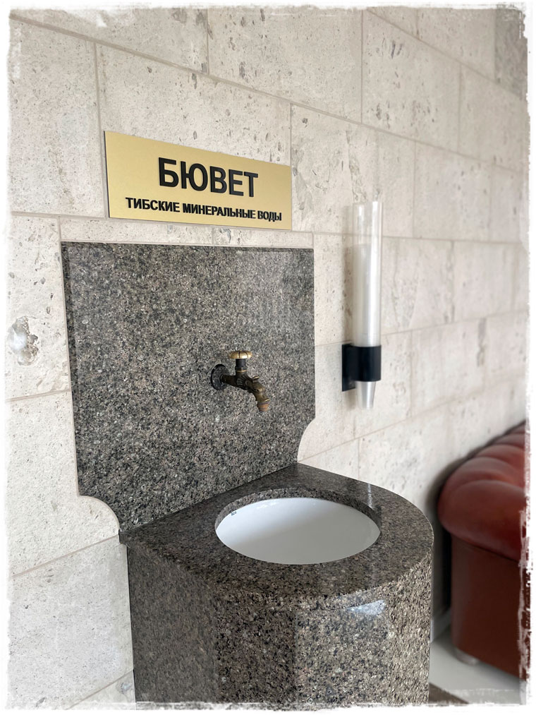 Термальный комплекс «Итальянские термы» находится на территории санатория «Машук Аква-Терм» в г.Железноводск. Добраться из Ессентуков сюда можно на электричке примерно за полчаса. Самое приятное, что вход в термы доступен всем, не обязательно в санатории отдыхать. Хотя для самих отдыхающих это скорее минус, особенно с местными ценами на лечение). Нам же, случайно заехавшим, все те же банно-термальные блага доступны без предварительной записи и по вполне вменяемой цене. Актуальную стоимость на официальном сайте — тык — смотрите.Я сюда приехала сразу с утра, когда кроме отдыхающих санатория, других посетителей еще не было. Полагаю, что пасмурное небо и прохладная погода всех распугали. Но совсем всё равно не остановили, поскольку после обеда людей значительно прибавилось, и мне лично уже стало тесно и неуютно. Так что советую пораньше приезжать, чтобы без посторонних тел в купелях успеть посидеть. И ещё, хотя я себя к гурманам не отношу, но в Итальянских термах с едой всё очень плохо. Кроме пиццы, сэндвичей и пары салатов в кафе нет больше вообще ничего. Понятно, что у гостей санатория своё питание по расписание, но получается, что посетителям терм есть практически нечего. Вполне возможно, что это целенаправленная тактика, чтобы надолго не задерживались. Потому как голод кого хочешь, даже из самой тёплой ванны, довольно быстро выманит.